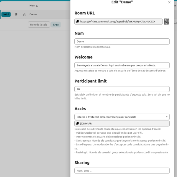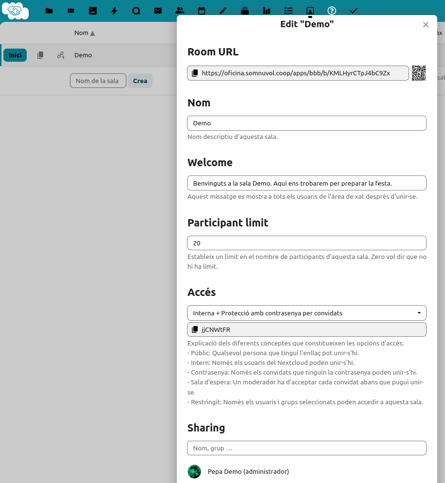 - Gestió: Monousuari amb una interfície de Nextcloud a través de bbbsales.somnuvol.coop, bbbsalas.somosnube.coop o bé bbbrooms.commonscloud.coop