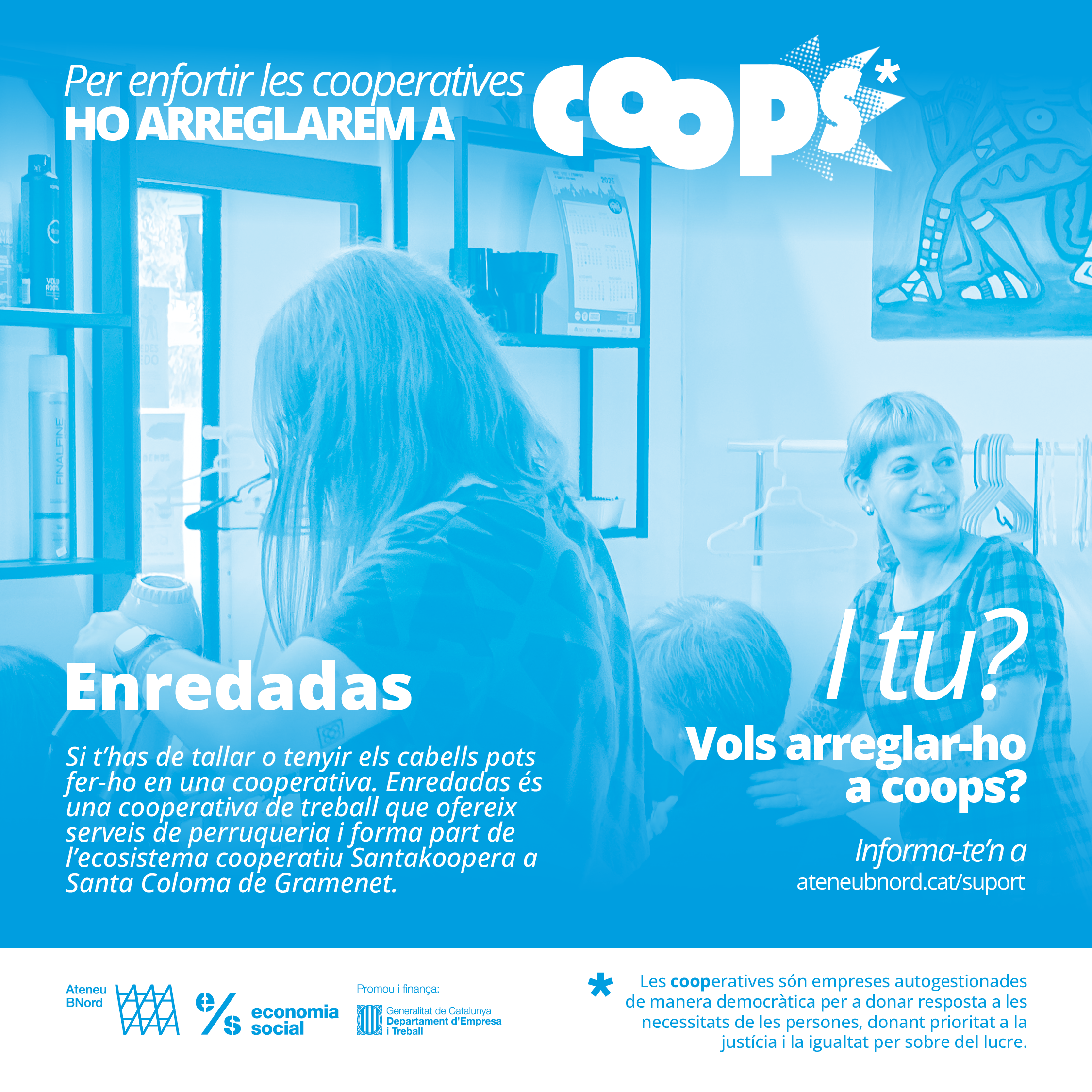 Enredadas és una cooperativa de treball que ofereix serveis de perruqueria i forma part de l’ecosistema cooperatiu Santakoopera a Santa Coloma de Gramenet. També anant a la perruqueria pots enfortir el cooperativisme.