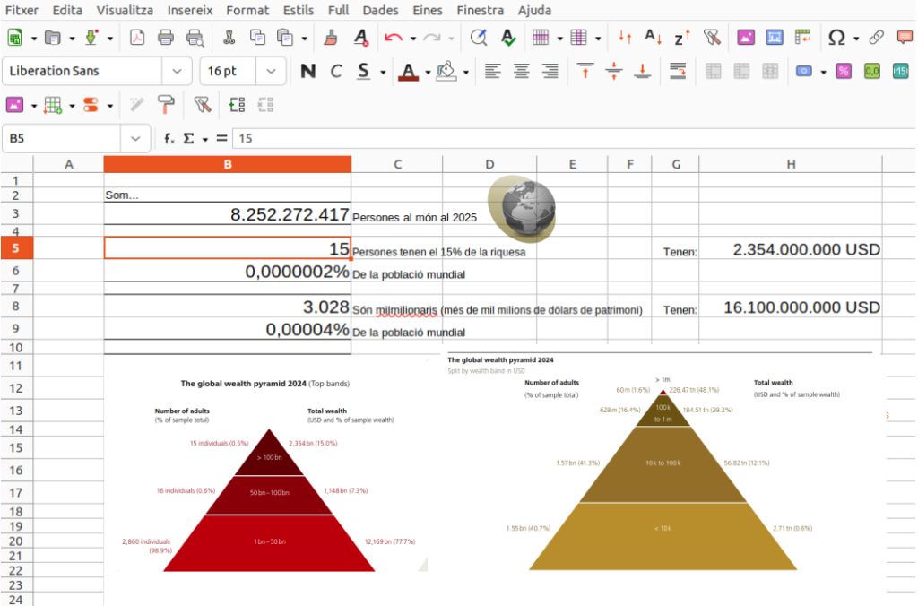 Per situar-nos recordem que som 8 mil milions de persones al món. I d’aquestes menys de l’1% té quasi la meitat de la riquesa. Si escapcem aquesta piràmide per dalt, segons Forbes unes 3.000 persones són mil-milionàries, són el 0,00004%. I el 15% de la riquesa mundial (informe UBS) està al vèrtex de la piràmide en mans d’un grup de persones que es poden comptar amb els dits. Evidentment no han acumulat aquesta riquesa pel seu propi treball. Ho han fet amb el treball de milers d’altres persones, amb l’extracció de valor de les nostres dades i interaccions socials i a través de l’especulació sobre el que valen les seves empreses.