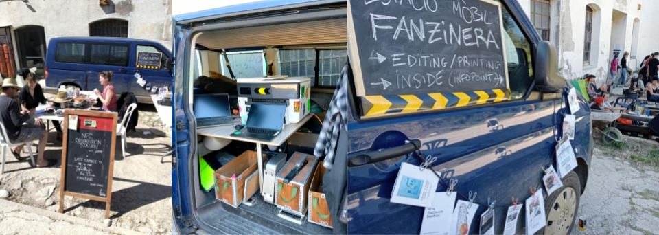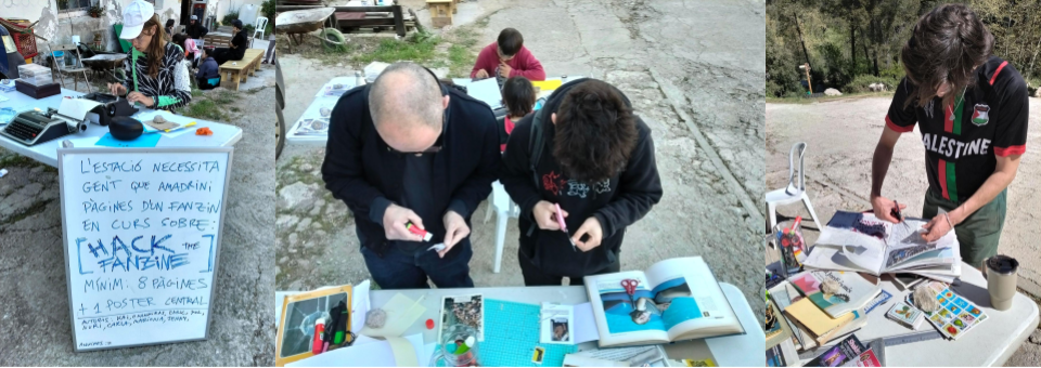 Igual que en altres convocatòries amb afluència de col·lectius i persones afins a l’autoedició i les publicacions alternatives, des que vam assajar aquesta fórmula de participació al festival re:publica, l’estació mòbil de co-creació proposa la impressió express de fanzins per mitjà de materials reapropiats: tot aplicant collages visuals, escriptura «artesana» i altres tècniques creatives analògiques. L’oportunitat, enguany, de fer-ho a Calafou va permetre no només la creació de tres versions diferents d’una petita publicació copyleft sota el lema «Hackeja el fanzín», sinó també experimentar la seva producció distribuïda en aquest espai-cruïlla d’alternatives ecosocials, que porta des de fa anys una llarga trajectòria de creació i difusió de la cultura fanzinera.
