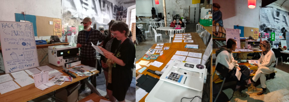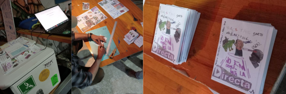 Per altra banda, vam aprendre encara més sobre com diverses persones expertes i autores entenen la creació i distribució de fanzins i, en definitiva, la seva cultura. En aquest context, l’estratègia de fer servir principalment materials en paper com a base, recombinar-los i escanejar-los, alhora que fer-ho col·lectivament i per imprimir de seguida, in situ, es veia també com una pràctica potent, de generació de comunitat i fins i tot «adversària» davant l’allau actual de continguts digitals cuinats sintèticament per mitjà d’eines d’intel·ligència artificiosa.